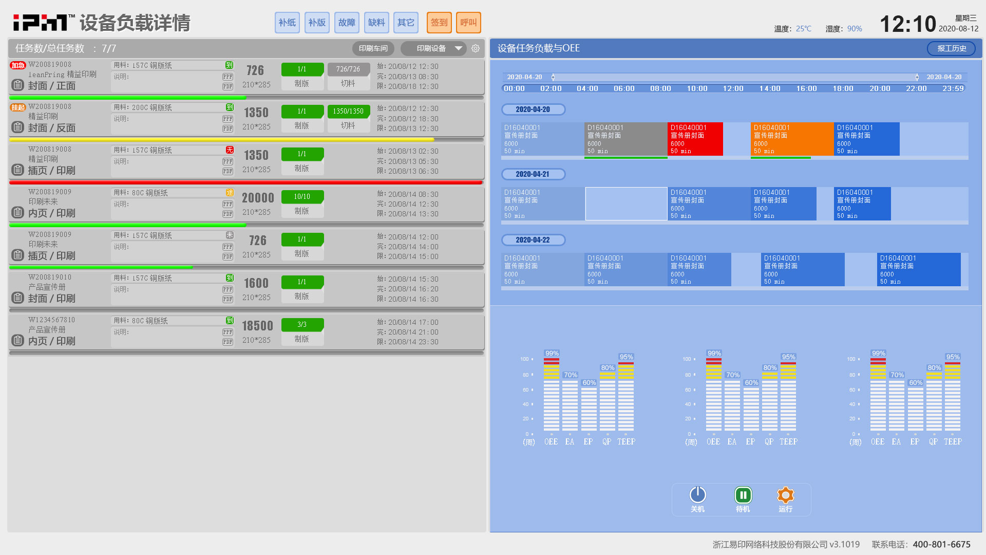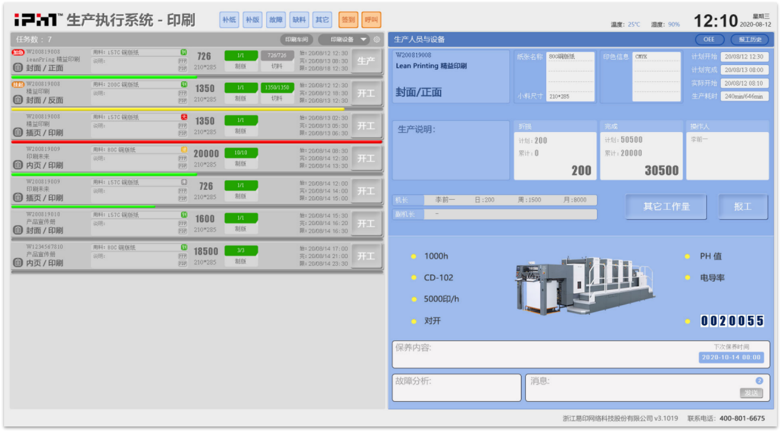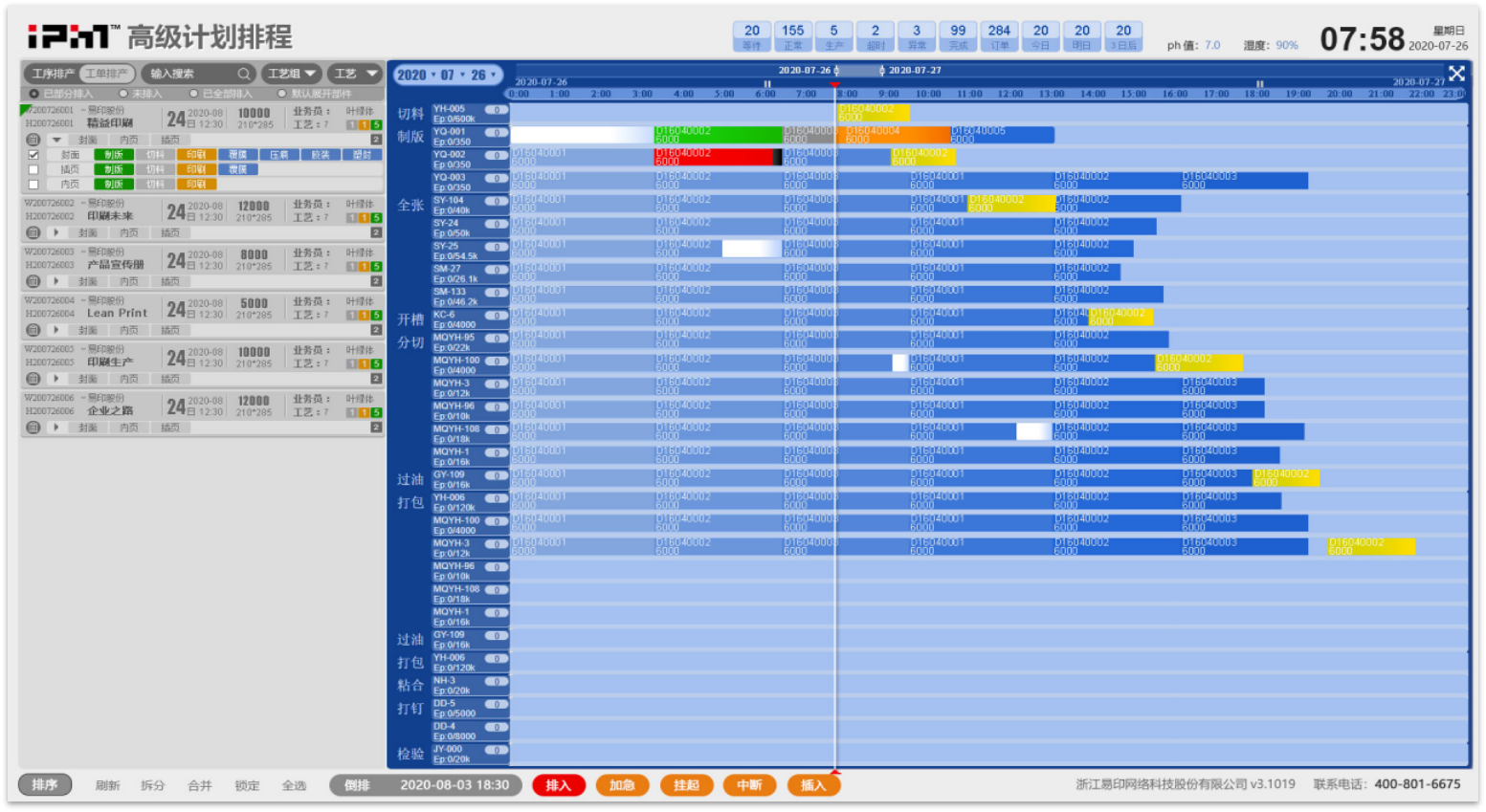 采用全新圖形化界面設計,界面與操作簡單友好,大幅度降低實施難度??蛇B接ERP系統,可用訂單工單與倉儲模塊,實時監控庫存原輔料領用狀態,下可對接設備實時數據交互,自動生成最佳印企有限產能下的最佳生產規劃,同時實時反饋生產異常情況,計劃動態糾偏,助力印企實現精益生產、走向智能制造!